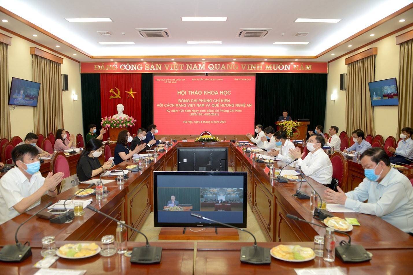 (LLCT) - Nhân kỷ niệm 120 năm Ngày sinh đồng chí Phùng Chí Kiên (18-5-1901 - 18-5-2021), ngày 08-5-2021, tại Hà Nội, Học viện Chính trị quốc gia Hồ Chí Minh, Ban Tuyên giáo Trung ương và Tỉnh ủy Nghệ An phối hợp tổ chức Hội thảo khoa học: “Đồng chí Phùng Chí Kiên với cách mạng Việt Nam và quê hương Nghệ An”. Hội thảo được tổ chức trực tuyến tại điểm cầu Học viện Chính trị quốc gia Hồ Chí Minh và tỉnh Nghệ An. GS, TS Nguyễn Xuân Thắng, Ủy viên Bộ Chính trị, Giám đốc Học viện Chính trị quốc gia Hồ Chí Minh, Chủ tịch Hội đồng Lý luận Trung ương dự và chủ trì Hội thảo.
